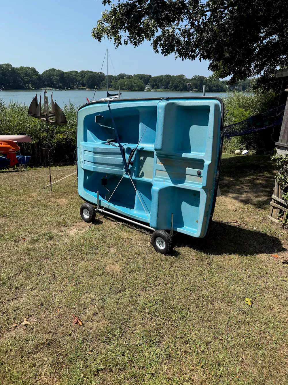 But Maker Pipe has solved both problems with my slide on, stand up pedal boat storage and transportation cart. It enables the craft to move easily up and down the dock and store in a standing position which collects no rain. The design allows the car to lay down so that the boat can slide up the support rails and then be lifted onto all four wheels. I couldn't be happier, and we are using the pedal boat and having drinks much more often.