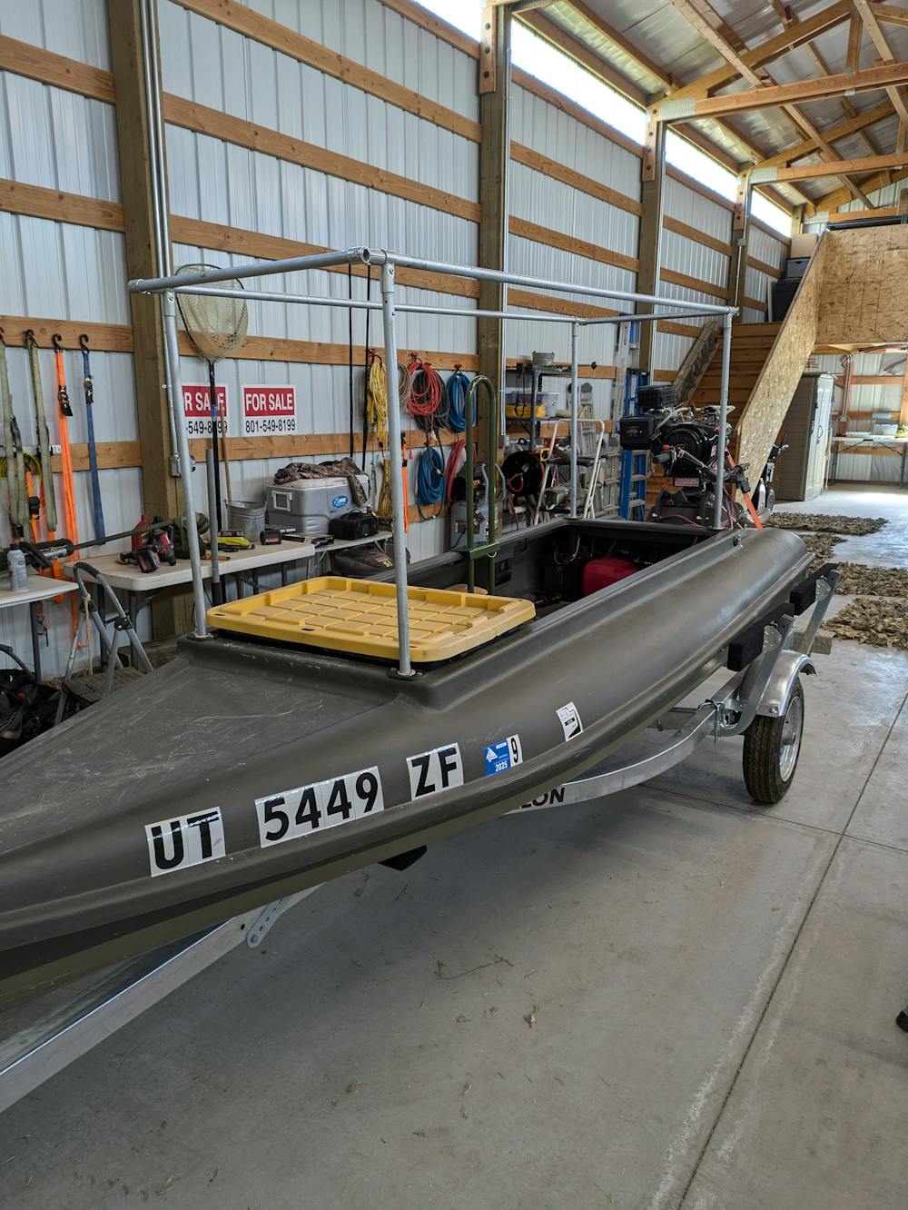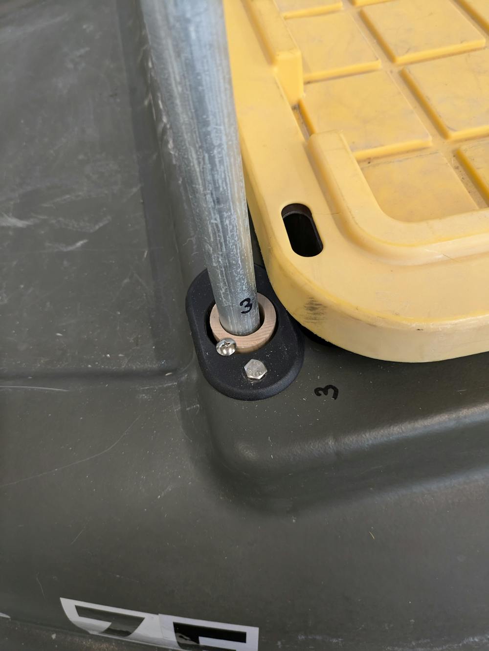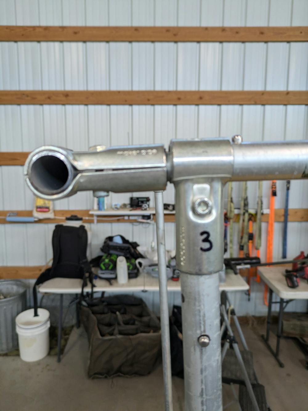 "I used ¾” EMT conduit for the main frame. I used ½” EMT conduit at the corners that slips inside the ¾” pipe. They are held in place by button spring clips inserted into the ½” pipe and pop up through the ¾” pipe as can be seen in this picture. The uprights are placed into fishing rod holders.