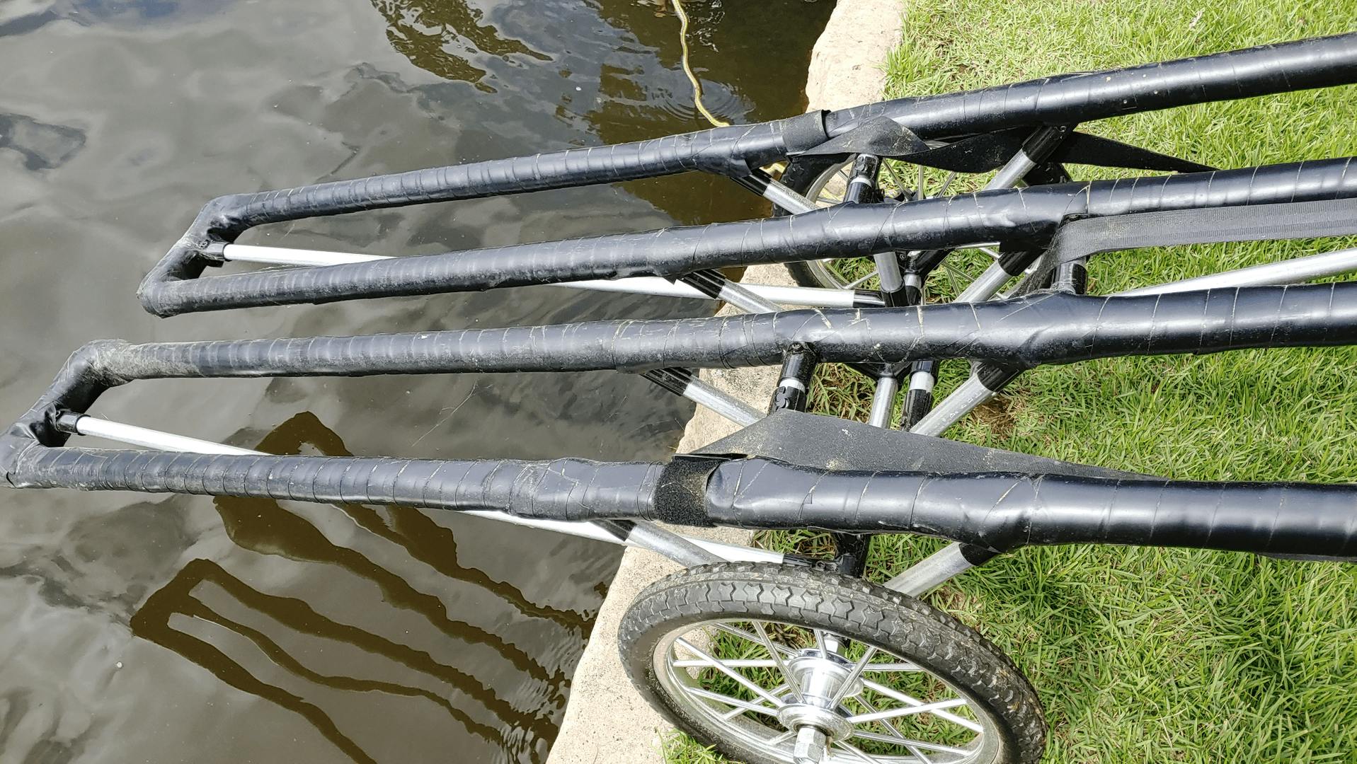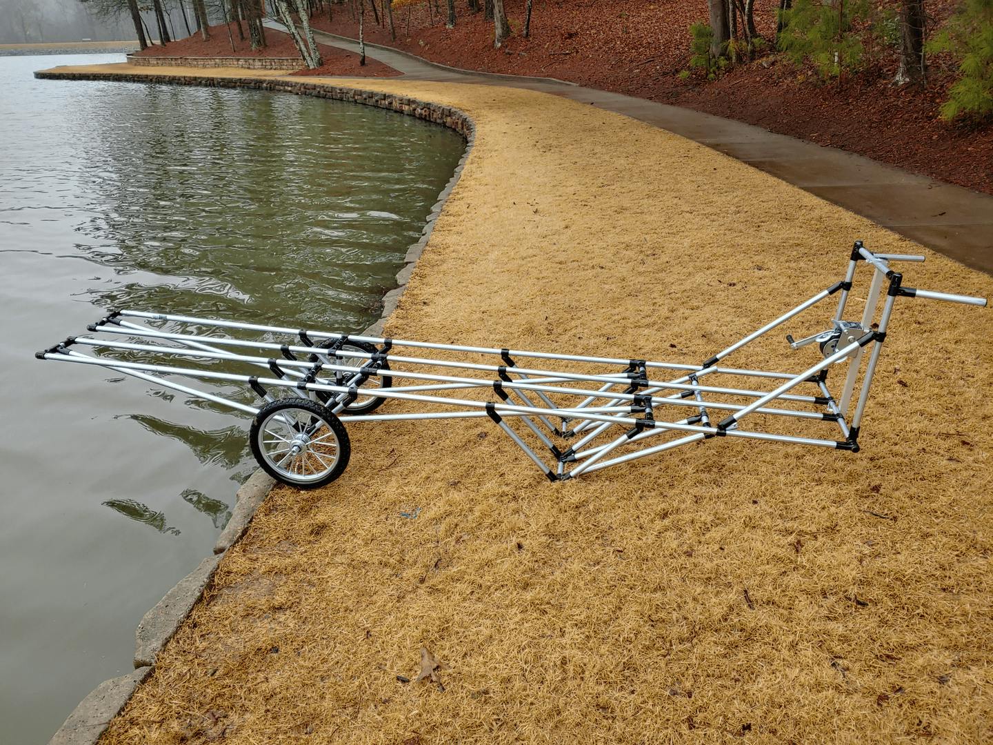 So I have designed Maker Pipe boat dollies that allow me to cart fully-configured boats down to the waters edge. Then they flip up and become boat ramps. I have built 4 boat dollies and each has a winch for lowering the boat into the water, and pulling it up onto the ramp.