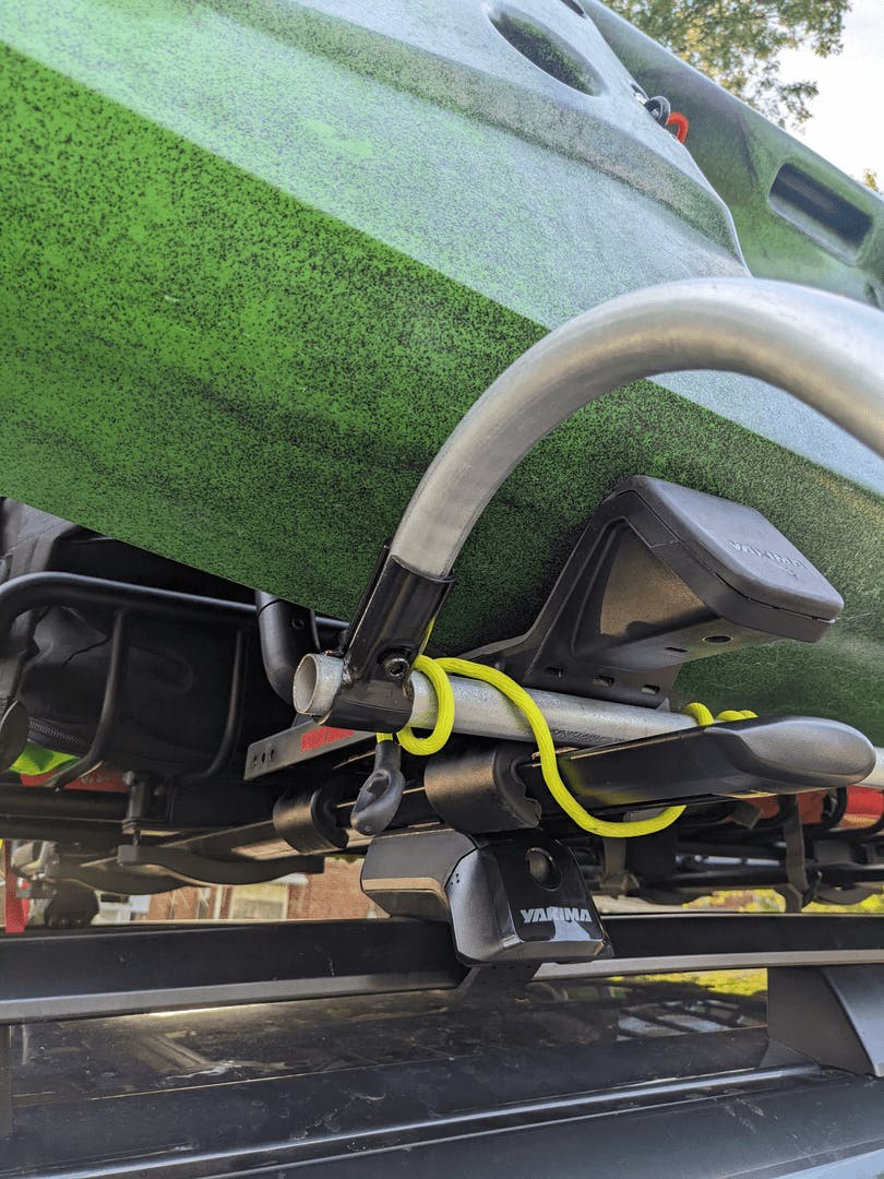 I bent the rail pipes 90 deg, and they are received by two T connectors on a flat pipe laying across the roof rack cross bars.