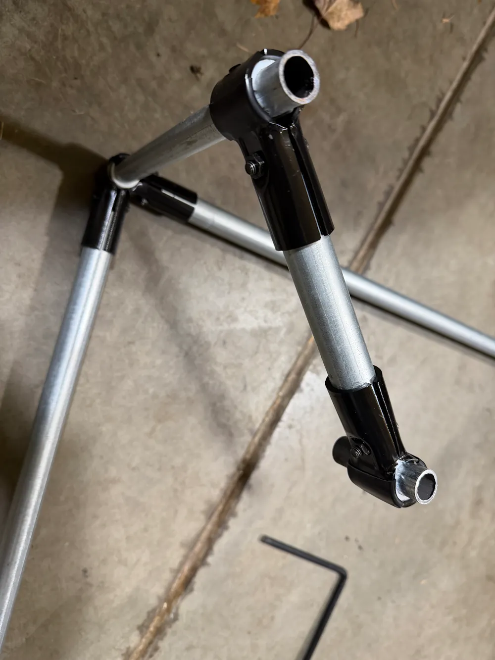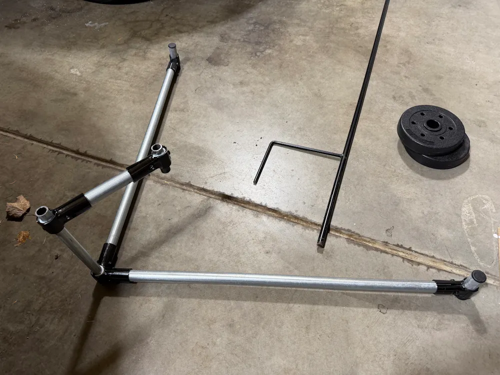 The setup is just a tripod, really, with enough vertical pipe to hold both legs of the hook and oriented so that the weight is supported by the two forward legs. It may not be completely necessary, but I added some weights to the legs to keep it stable over winter should it get windy.