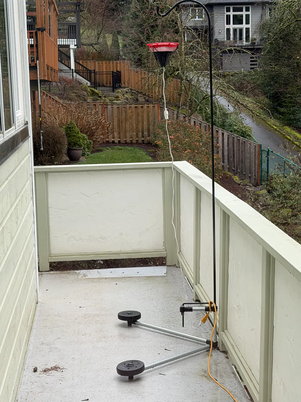 It has been a while since I built anything worth sharing, but this simple setup is worth sharing. I wanted to position our heated hummingbird feeder in front of a second story window. There is a deck, but with so much water affecting structures here in the Pacific Northwest, I wanted to avoid holes into the railings not to mention puncturing the vinyl-clad deck surface.