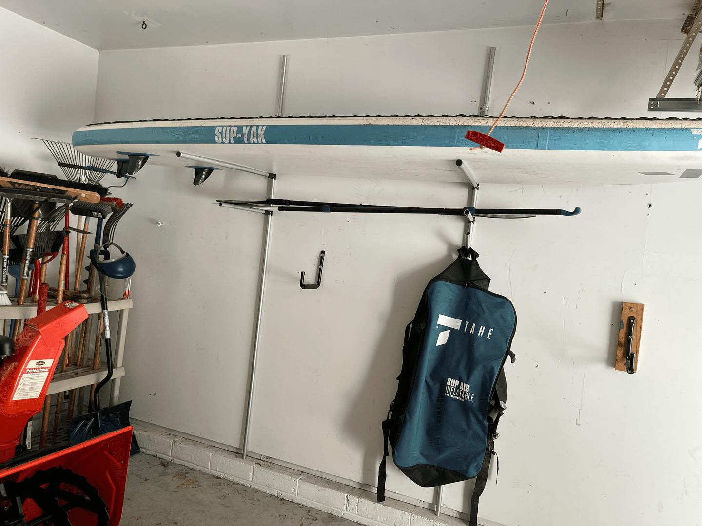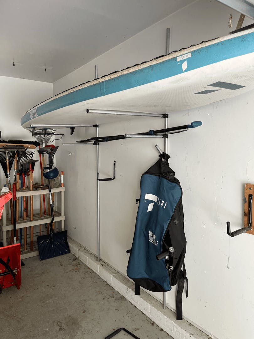 Stow away garage Paddleboard rack. 8’ conduit vertical pieces and scraps. Folds away when not being used.