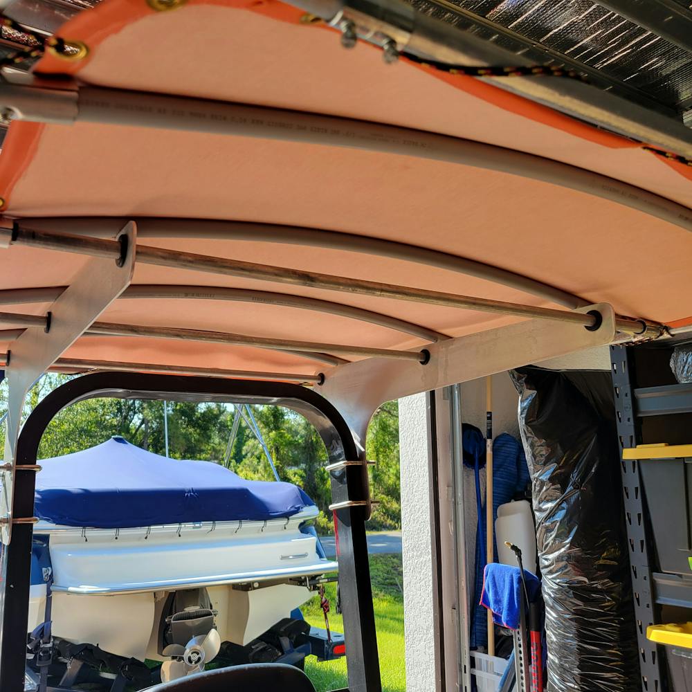 "I wanted to share with you what I made with your 1/2" conduit T-fittings. I needed a lightweight canopy for my tractor. Lightweight so as not to become top-heavy, because of the sideways hills I have to mow. Your fittings work with 1/2" EMT obviously, but they also work with 1/2" Sched 40 PVC conduit with the addition of a ~1"x1"x1/16" piece of rubber sheet, omitting the plastic reducer. I used the PVC for the arcs to support the vinyl. The brackets worked great for the PVC too.