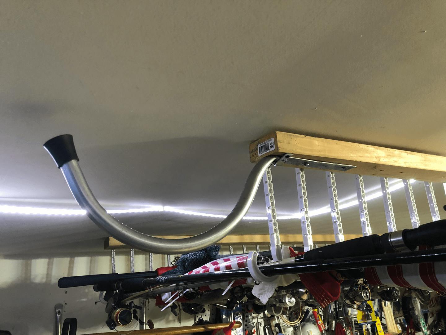 *bonus*: also not original with me and unfortunately I have forgotten where I saw it but the el cheapo plastic pipe hangers (white things shaped like a โ J โ in the background) - you can get the big box stores - are perfect for hanging fishing rods from the ceiling like a buck apiece in the plumbing section and you can use to hang rods or extra pieces of conduit or anything else that is long, from the ceiling. plus, its very easy to take the fishing rod our for use and same with putting it back up when done.