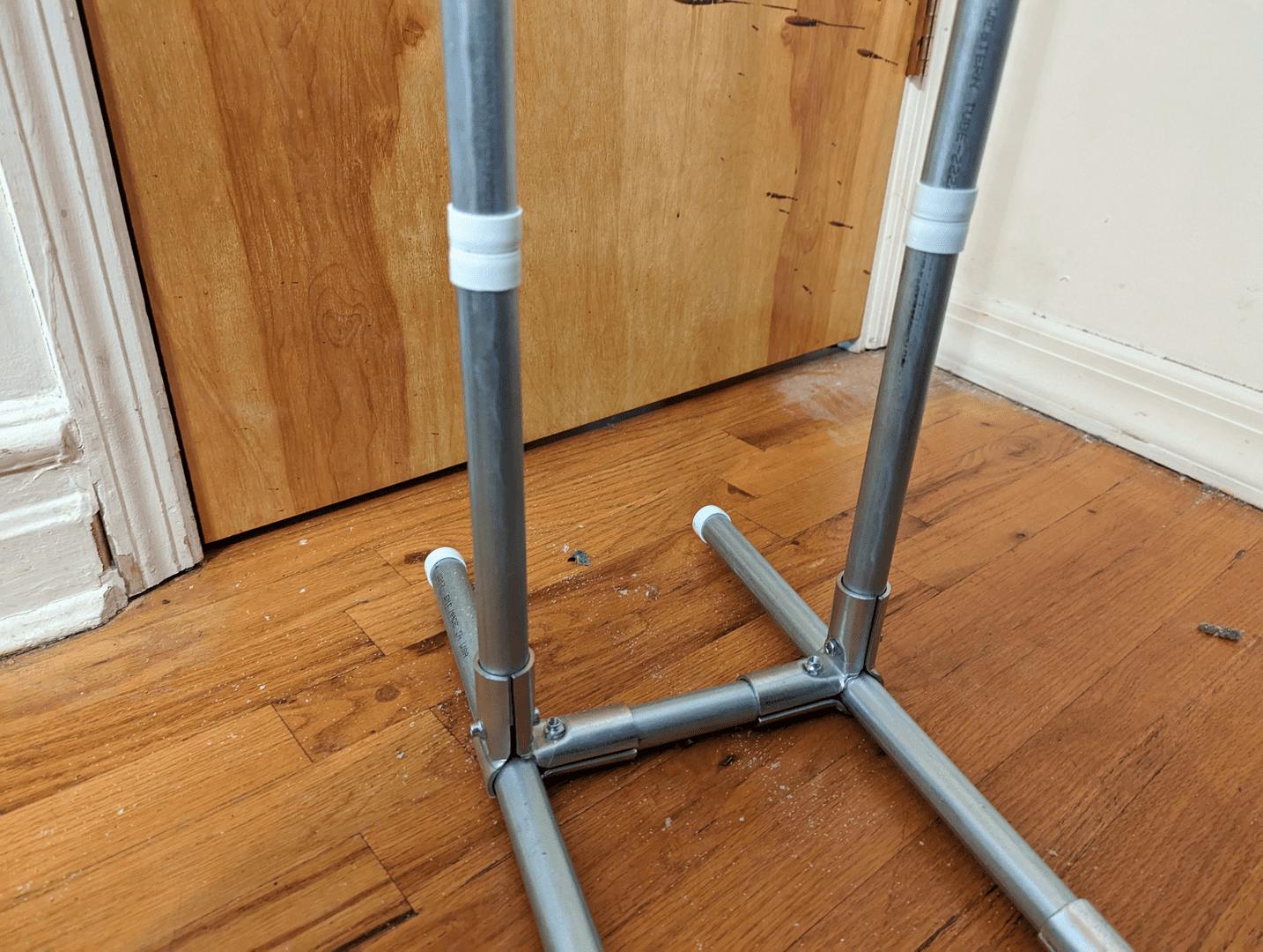 One unexpected issue was that I had to add a cross piece between the legs at the base to prevent the legs from rotating laterally. Because the top part slides over the stakes, the length of the legs is not fixed, which allows the whole thing to go out of square. There isn't enough friction to keep the angle. I can imagine this could be a useful for technique for someone.