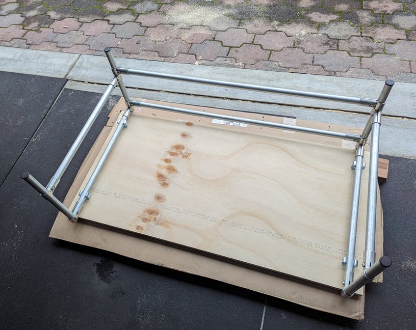 The deck is ¾” plywood that I purchased (1/4 sheet) from Home Depot. The finish cut is 21 ½” deep x 43” wide. This is not as deep and wider than the frame. I wanted to expose the end plugs so that I can extend the height (using nut inserts instead of plugs). This can be done at a later time.